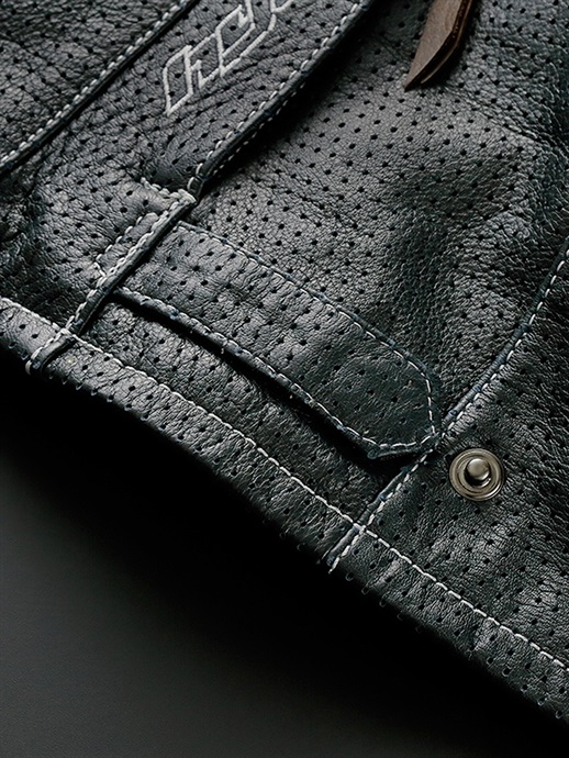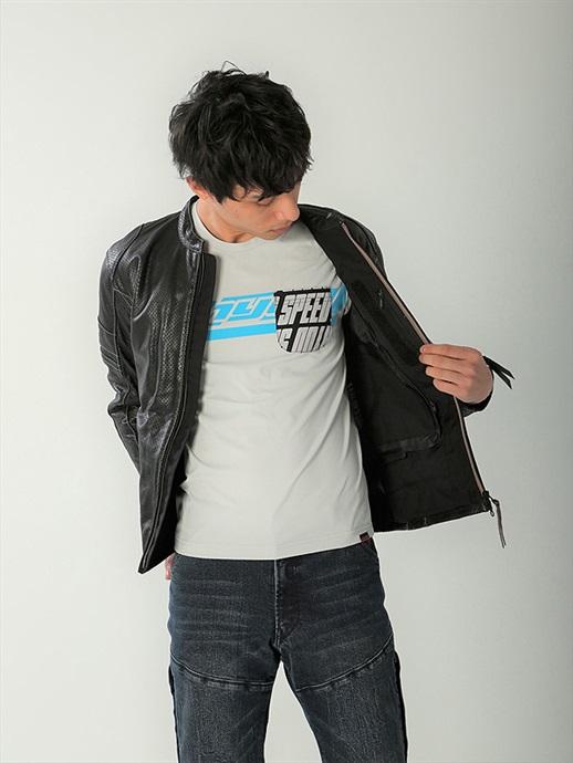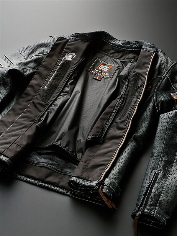 レザーには身体に馴染みやすく、しなやかで柔らかい着心地のカウライトレザーを採用。パンチング加工を施し、春夏シーズンの着用に配慮しています。本体裏地には吸汗・速乾性に優れたHYODロゴ入りのエアーメッシュにより、快適な夏のライディングを実現。また気温が低い時にも対応できるように、着脱可能なウインドブロックインナーも装備。気温の変化に合わせて簡単に着脱できるので、シーズンを通して長く着ていただけます。