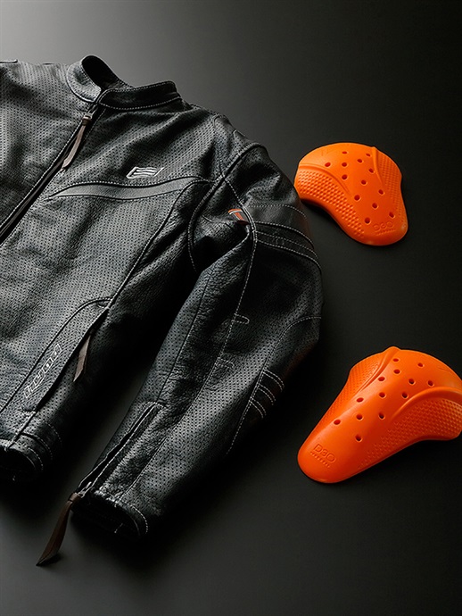 フィット感の高いレーシングレザースーツ譲りのHYODオリジナルのライディングパターンを採用し、ショルダーとエルボーには、衝撃吸収力と装着感に優れたHYODオリジナルD3O®プロテクター、バックボーンにはしなやかにフィットするフォームパッドを装備しています。