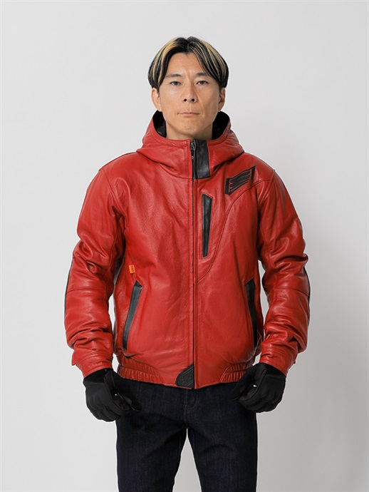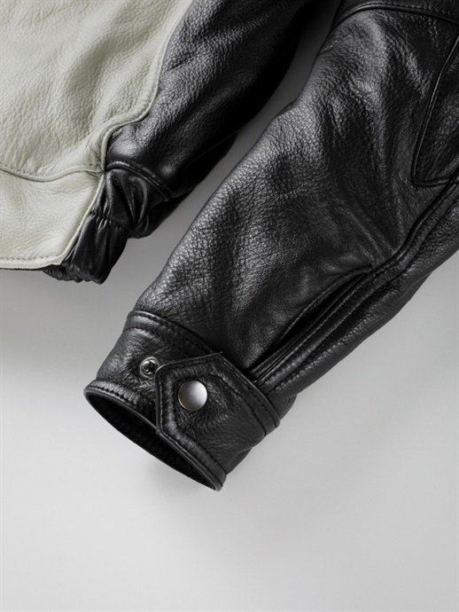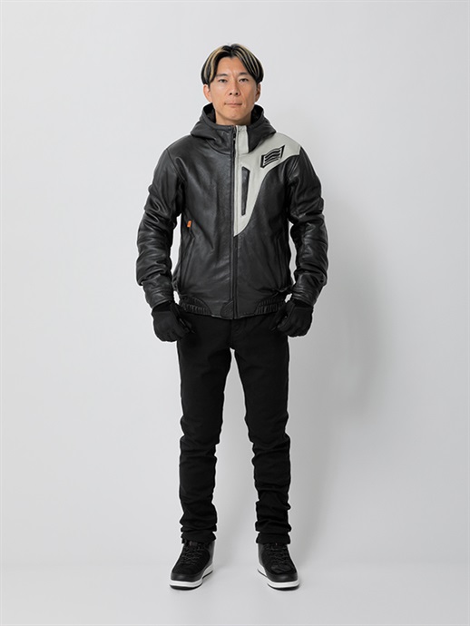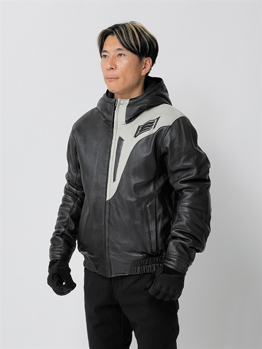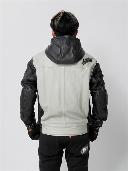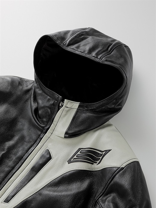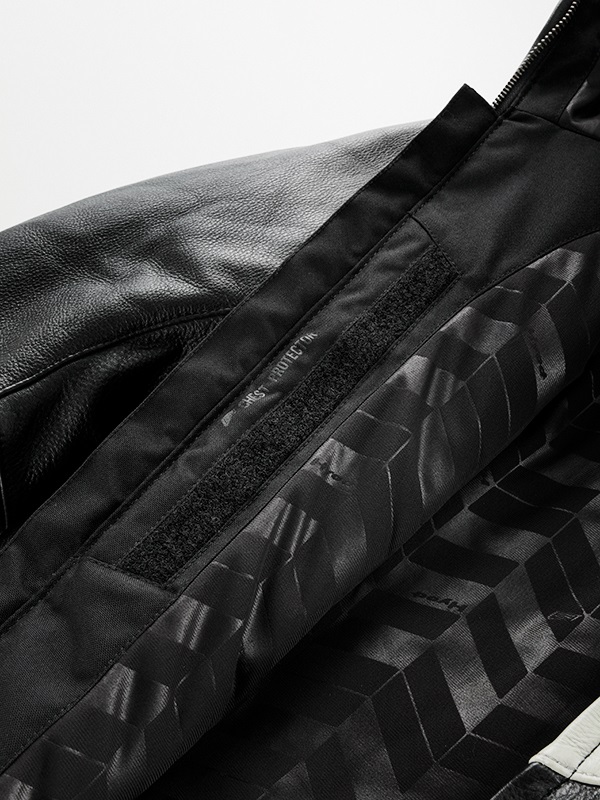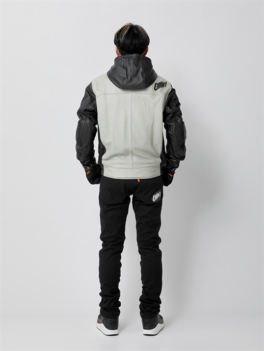 しっとりと仕上げたツートンダイレザー(ブラック・アイボリー)と“スタジャン”のフォルムを採り入れたST-Xレザーウエアのニューモデル。身頃には保温性の高いポリエステル中綿をインサート。袖口のレザーカフスと左胸のレザークレストはスタジャンからのインスパイア。レッドの革のみ、しなやかさが特徴のカウライトレザーを採用しています。防寒性能とルックスを兼ね備えた中綿入りのフーデッドレザーウエアに仕上げています。肩と肘に装備されたエアースルー構造のD3O® Diablo™プロテクター(CE規格・LEVEL1認証)は、薄くて軽く、まるで着けていないかのような着心地を生みだしています。