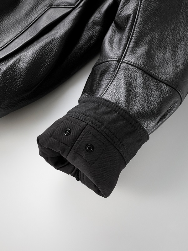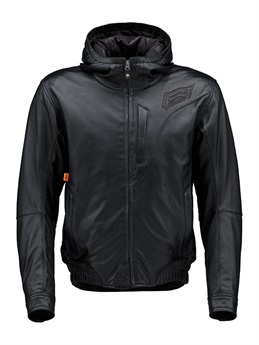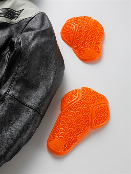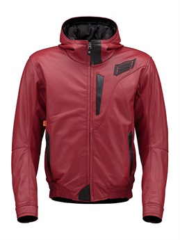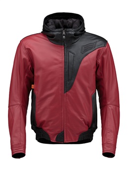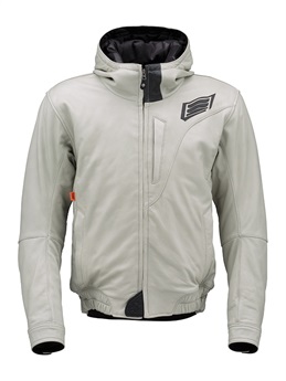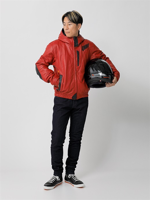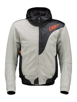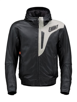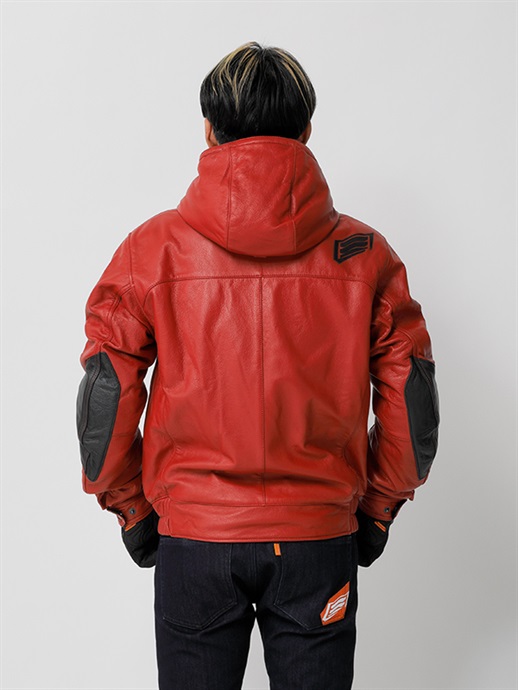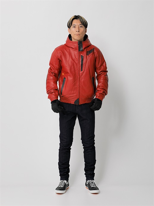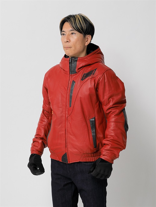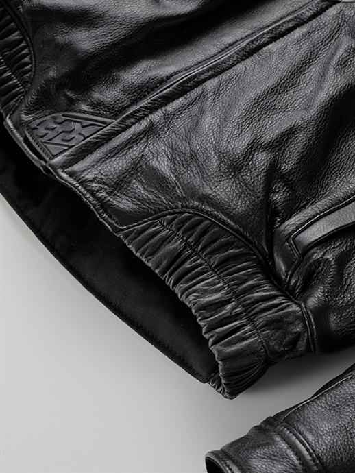 しっとりと仕上げたツートンダイレザー(ブラック・アイボリー)と“スタジャン”のフォルムを採り入れたST-Xレザーウエアのニューモデル。身頃には保温性の高いポリエステル中綿をインサート。袖口のレザーカフスと左胸のレザークレストはスタジャンからのインスパイア。レッドの革のみ、しなやかさが特徴のカウライトレザーを採用しています。防寒性能とルックスを兼ね備えた中綿入りのフーデッドレザーウエアに仕上げています。肩と肘に装備されたエアースルー構造のD3O® Diablo™プロテクター(CE規格・LEVEL1認証)は、薄くて軽く、まるで着けていないかのような着心地を生みだしています。
