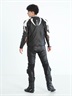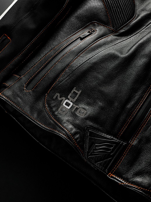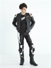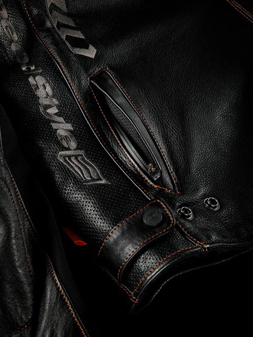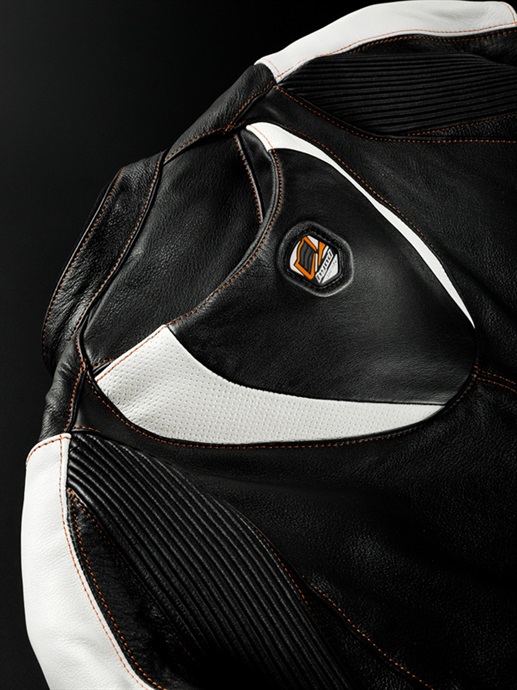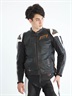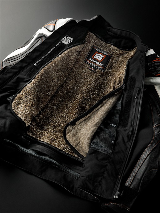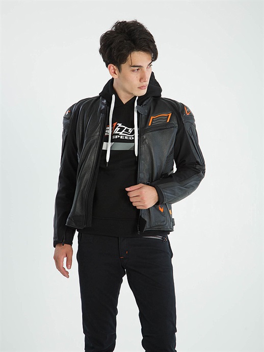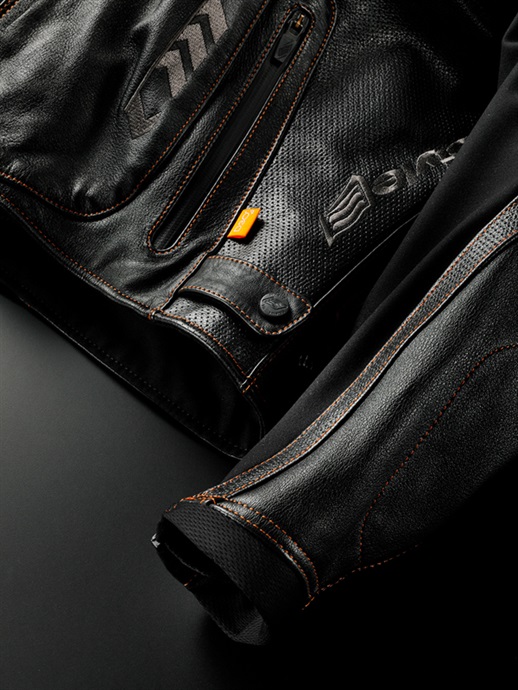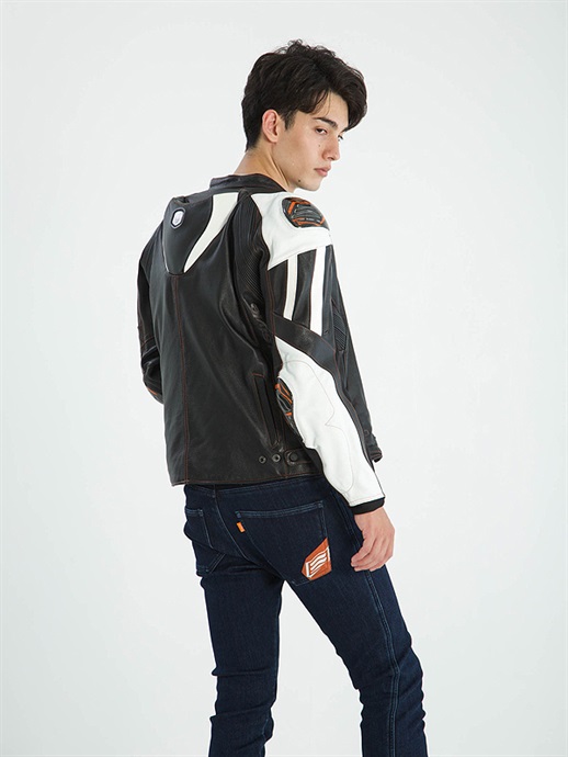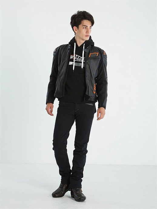 左右非対称デザインとグラフィックがスポーツマインドを奮わせる、ST-Xレザージャケットの上級スポーツモデルです。素材のレザーは着心地軽やかなカウライトレザーメインに使い、耐摩耗強度に優れるドットエンボスレザーを部分的に組み合わせています。本体裏地には吸汗・速乾性に優れたHYODロゴが入ったエアーメッシュを採用するほか、着脱可能なアクリルシープボアベストも装備しています。肩と肘には従来モデルに搭載されていたD3O®プロテクターから通気性に優れたD3O® AIRプロテクターを採用し、外側にはアウターカーボンプロテクターを装備。また、背中にはD3O® VIPER STEALTHバックボーンプロテクターを装備しています。その他にもスポーツネックガード、脇シャーリングを装備、さらには脇から袖口にかけて防風ストレッチナイロンを使い運動性を向上させています。胸部にはチェストプロテクターを装着するためのアタッチメントを標準装備。パンツとのジョイントが可能なHYODスポーツシステムも装備しています。