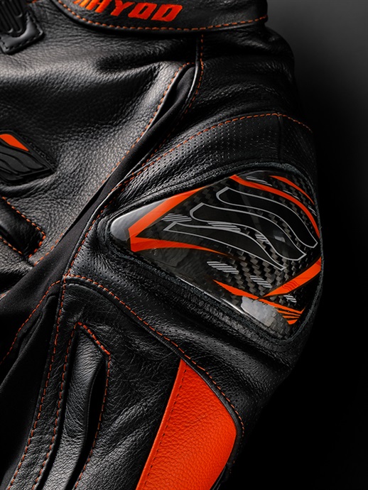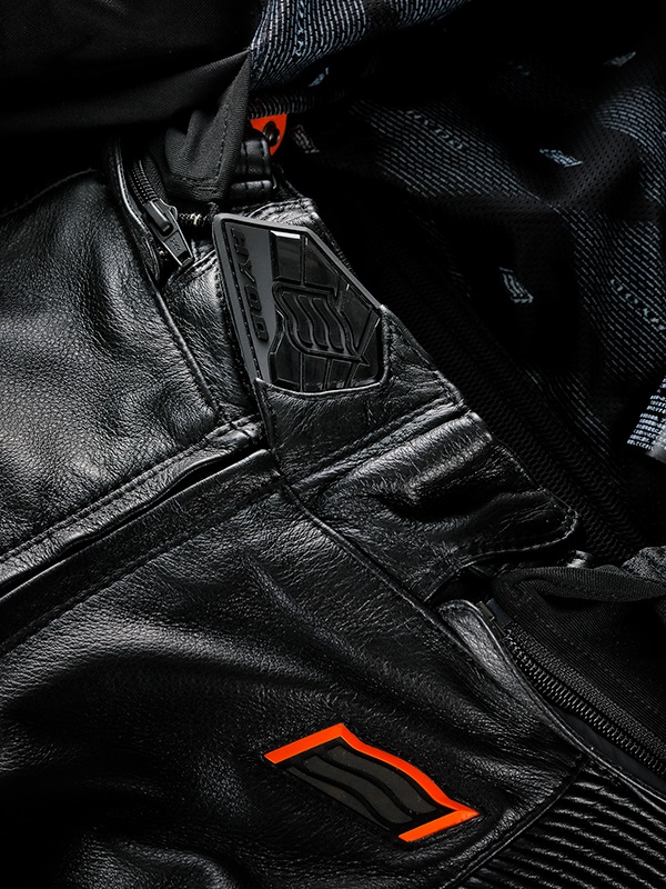HYOD ST-Xシリーズのハイエンドとして人気を博してきたDEVAC(デバック)には、ショルダーとエルボーにHYODレザースーツのハイエンドモデルに搭載されているサーフェイスカーボンプロテクターが装着されています。万が一の転倒時にその衝撃を最大限に逃す働きを発揮します。