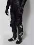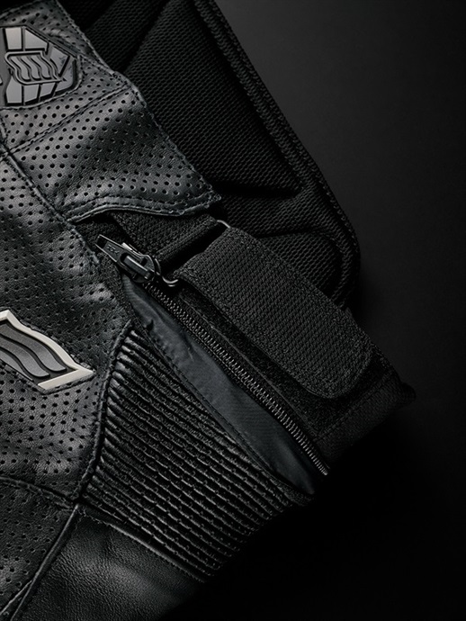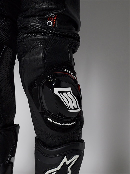 膝から脛(すね)にかけては、HYODレーシングレザースーツに搭載しているD3O®プロテクターをインサートしたハードプロテクター(CE規格適合品)を装備し、ヒップ(腰サイド)にはフィット感に優れるフォームタイプのプロテクターを装備。また、膝にはレーシングスライダーを標準で装備しています。