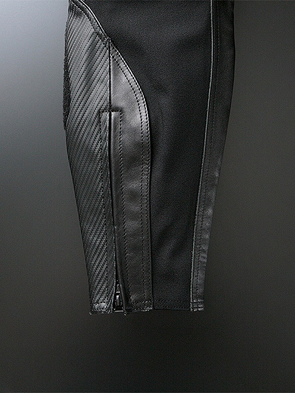 キメが細かく上品な光沢感と風合いを持つフラットステアレザーを採用しています。股下から裾口にかけては耐摩耗性に優れたストレッチナイロンを使って可動域を高め、運動性を向上させています。