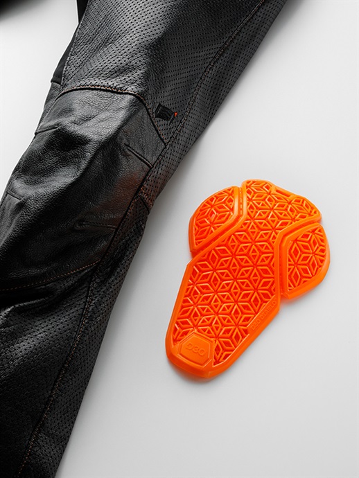 プロテクションには、軽量で柔軟なD3O® Diablo™ニープロテクター(CE LEVEL1)を装備。膝位置は幅広く調整でき、体型やライディングフォームに合わせたフィッティングが可能です。ニーグリップ部にはあえてノーマルレザーを採用し、バイクとの一体感にも配慮しました。