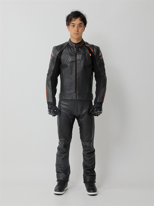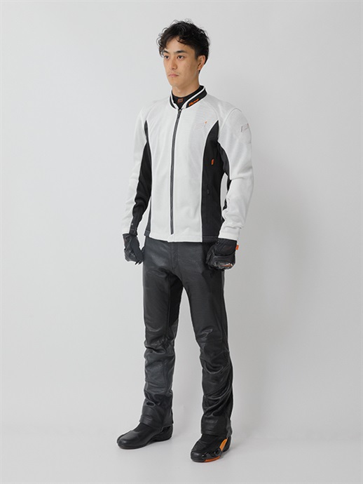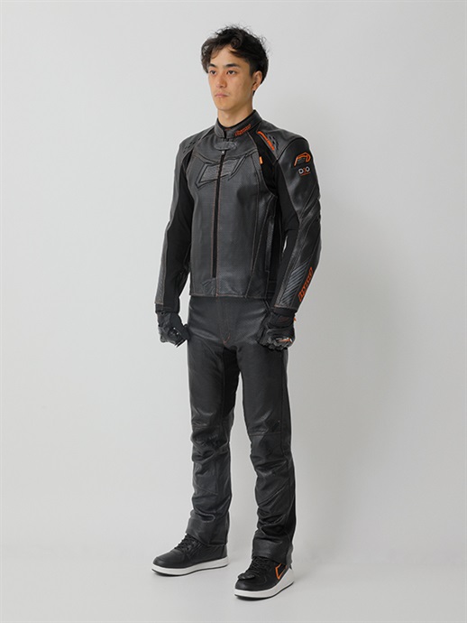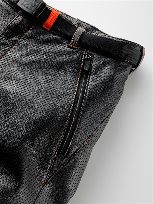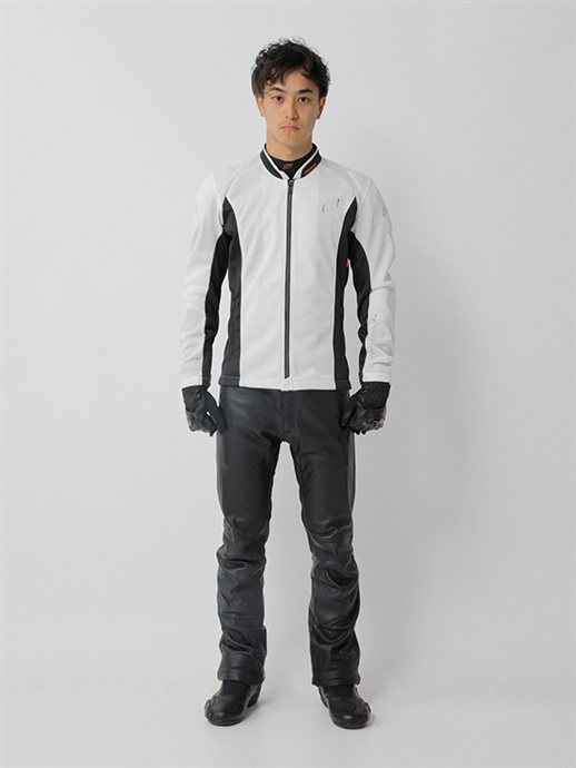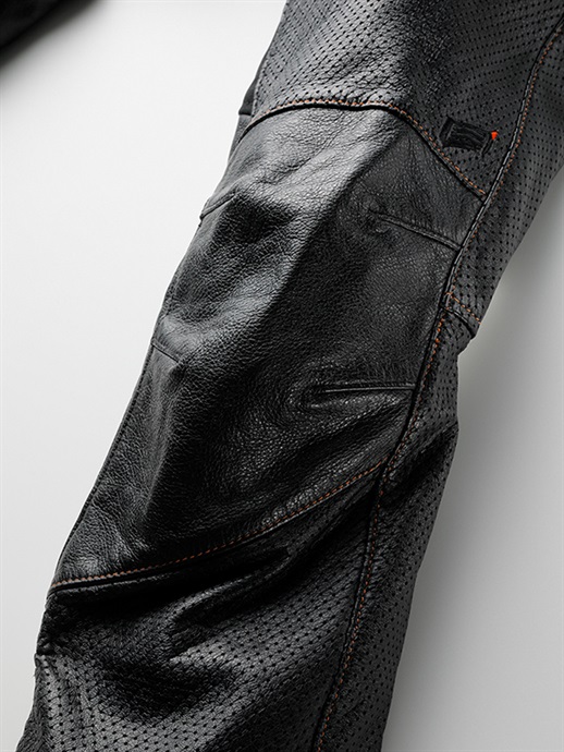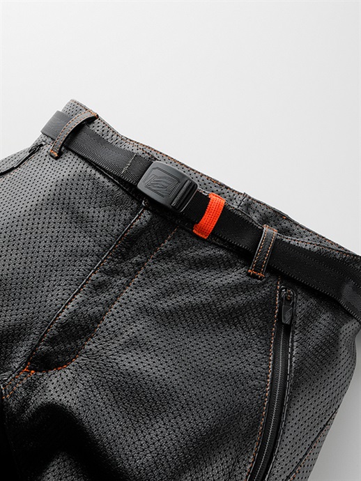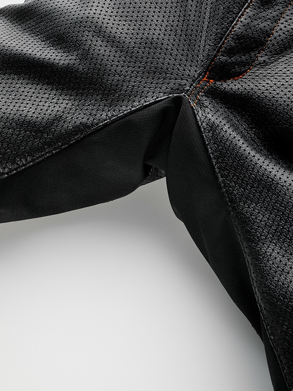 素材には、軽さとしなやかさ、十分な強度を兼ね備えたカウライトレザーベンテッドを使用。1.5mmのピンホール加工により通気性を確保し、レザーならではの安心感を保ちながら、暑い季節でも比較的快適な着用感へと整えました。股下にはストレッチパネルのガセットを配置し、足の開きや体重移動を自然にサポート。ワインディングでの積極的な動きから、ゆったりとしたツーリングまで、幅広いライディングにしなやかに追従します。