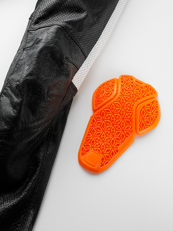 プロテクションには、柔らかく軽量なD3O® Diablo™プロテクター(CE LEVEL1)を装備。ニープロテクターは位置調整が可能で、体型やライディングスタイルに合わせたフィッティングに対応します。ニーグリップ部にはあえてノーマルレザーを採用し、バイクとの一体感にも配慮しました。
