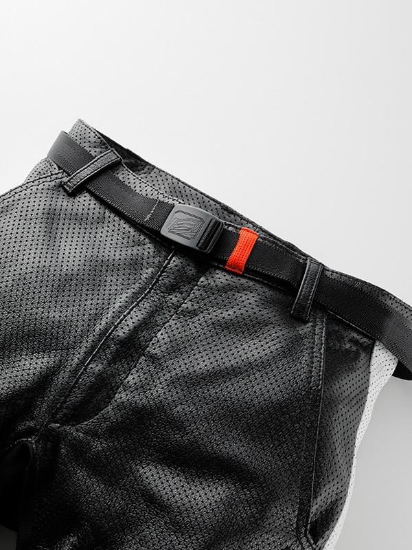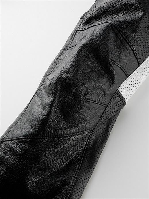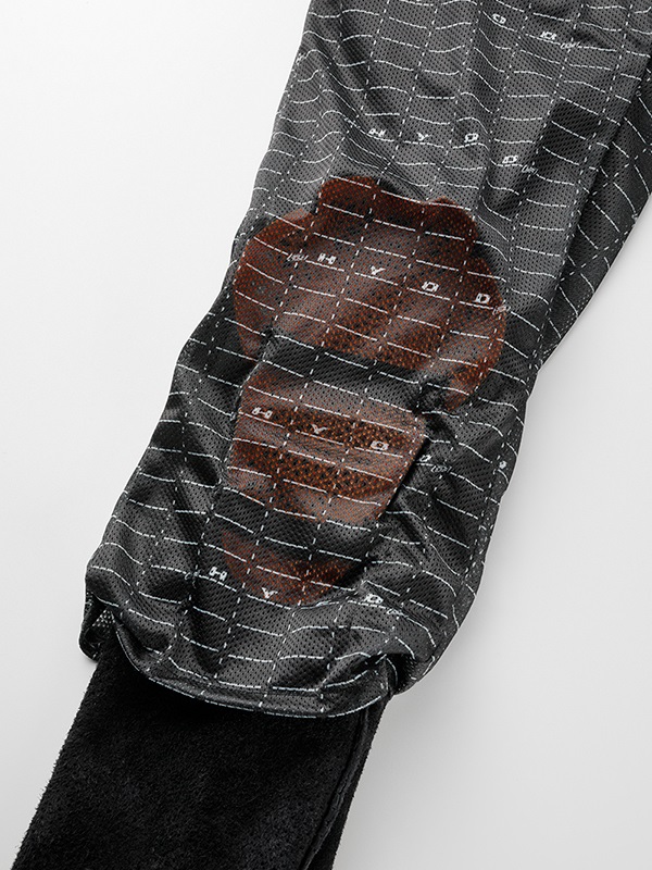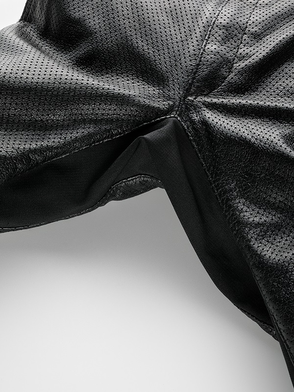 素材には、軽さとしなやかさ、そして高い強度を兼ね備えたカウライトレザーベンテッドを使用。1.5mmのピンホール加工により通気性を確保し、レザーならではの安心感を保ちながら、暑い季節でも比較的快適な着用感へと整えました。股下にはストレッチパネルのガセットを配置し、足の開きや体重移動にもスムーズに追従します。