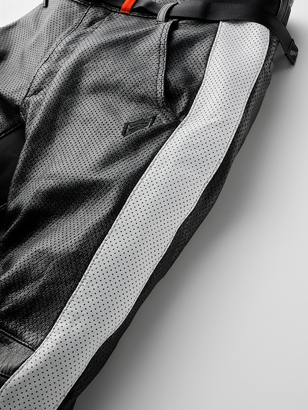 ST-X D3O® RIDE MESH LEATHER PANTS〔SIDE LINE〕は、レーシングスーツ開発からのフィードバックをベースに、スポーツライディングからツーリングまで幅広いシーンに対応するよう設計されたST-Xレザーパンツ。レギュラーストレートシルエットにサイドラインの切り替えを加え、軽快さと躍動感をさりげなく表現しています。