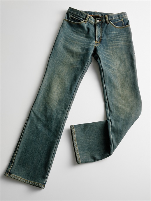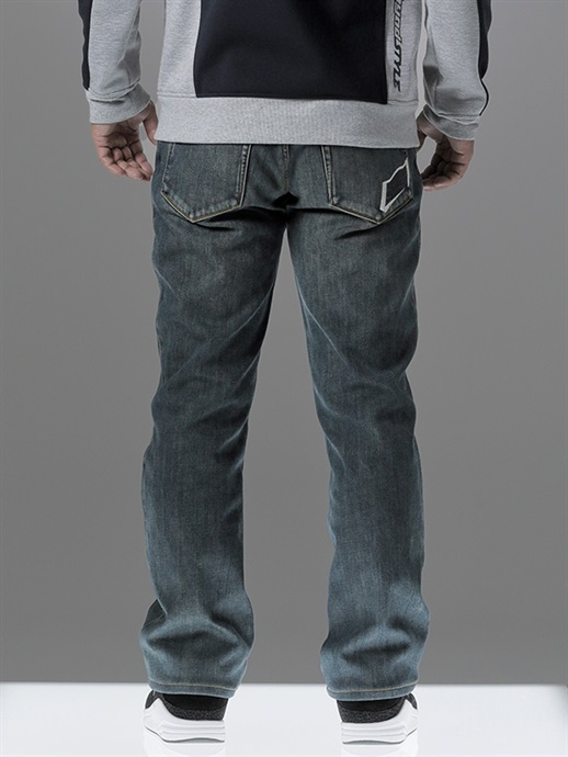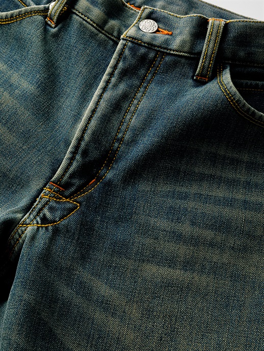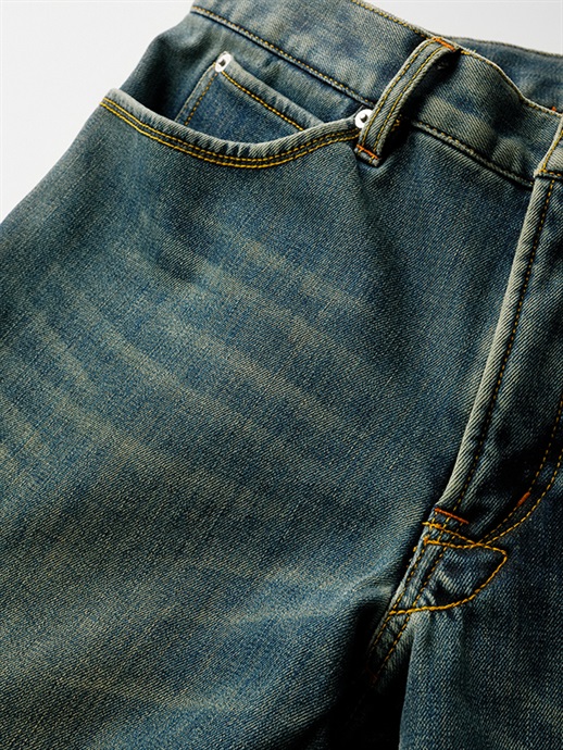 レギュラーオンスのストレッチデニム生地を使っています。シルエットはオーソドックスなレギュラーストレートで仕上げています。