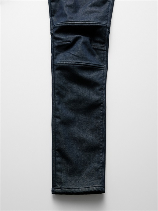 レギュラーオンス(10.25oz)のストレッチデニム生地を使っています。裾にかけてタイトになっていくバイカーズパターンを採用しています。ブーツインスタイルやライドスニーカーとのカジュアルスタイルまで、すっきりとしたボトムラインを演出します。