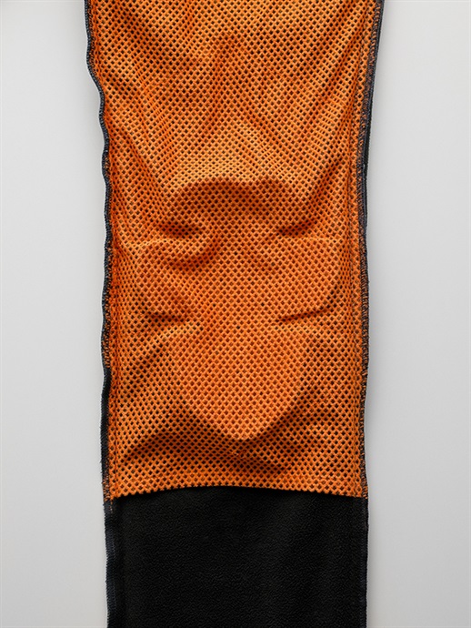 裏地(ソーラーセンサー)にプロテクターを装着する構造になっています。膝部分にプロテクターの位置を決めるステッチを設けていますので、それを利用して膝プロテクターの位置を2段階で調整することができます。標準装備の膝プロテクターは下側で装着されています。