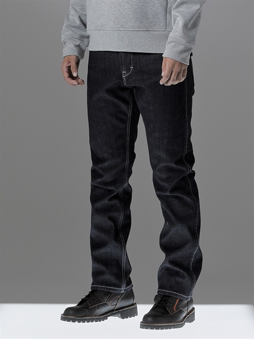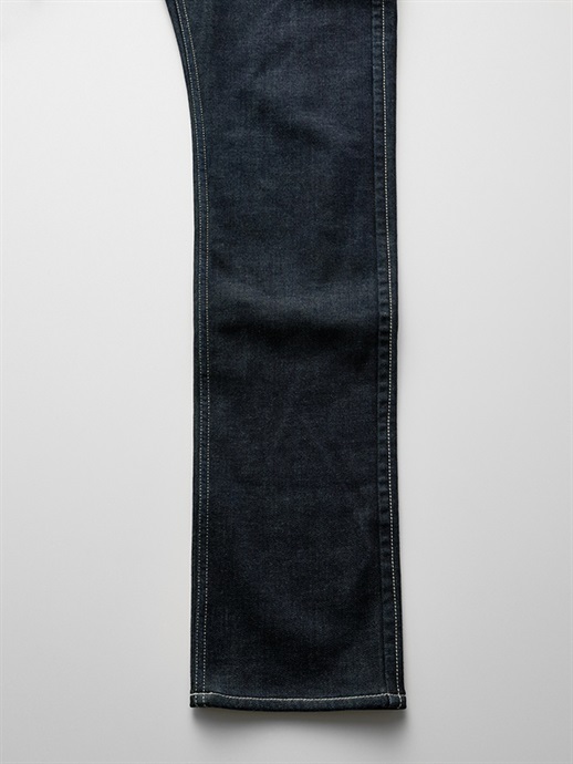 レギュラーオンス(10.25oz)のストレッチデニム生地を使っています。レギュラーストレートをベースにエンジニアブーツにあわせて膝から裾にかけてゆるやかにテーパードさせた、ブーツインスタイルができるシルエットで仕上げています。