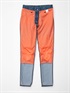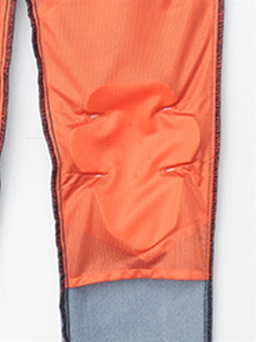裏地(メッシュインナー)にプロテクターを装着する構造になっています。膝部分にプロテクターの位置を決めるステッチを設けていますので、それを利用して膝プロテクターの位置を2段階で調整することができます。標準装備の膝プロテクターは下側で装着されています。