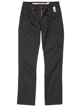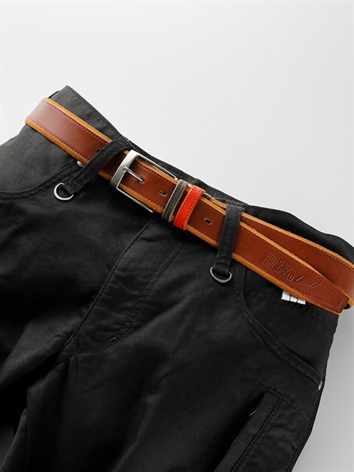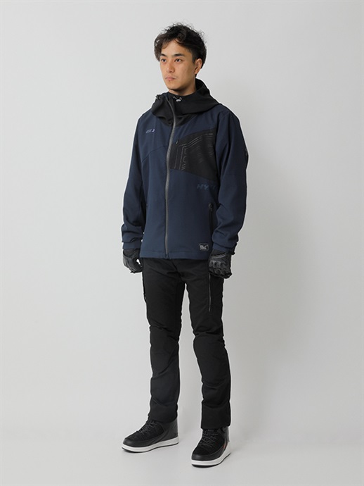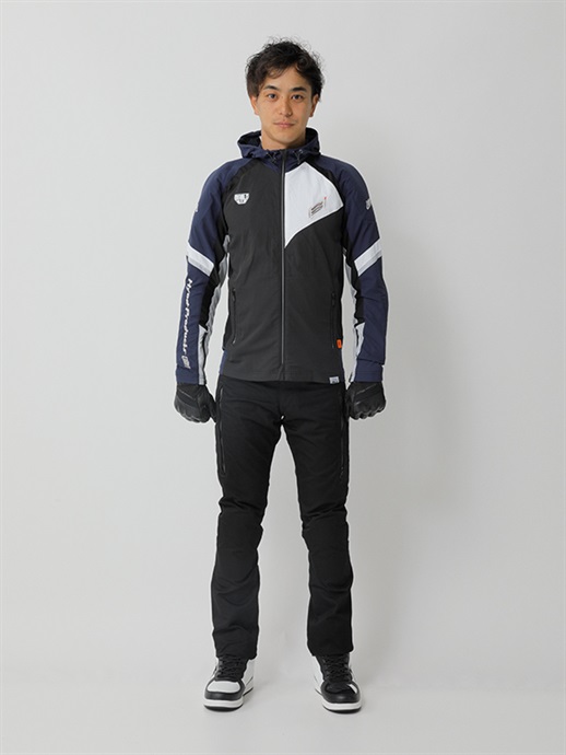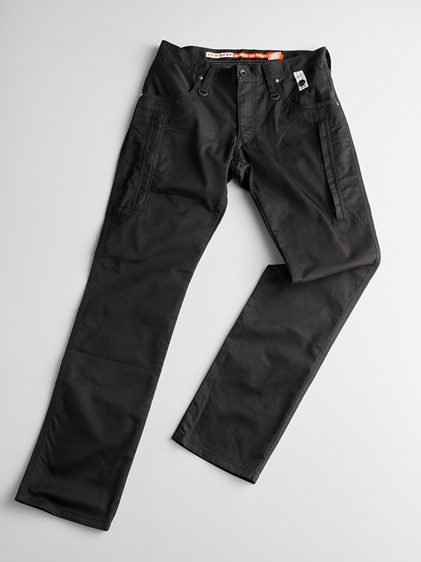 パターンには、股がみの深さを徹底的に研究して導き出したHYODライディングデニムパターンを採用。前傾姿勢でも腰まわりが自然に追従し、背中が出にくい設計としています。足の開きを妨げず、膝も曲げやすい立体構造により、走行中の動きにもスムーズに対応。腰まわりのフィット感と安定感を両立し、長時間のライディングでも快適な状態を維持します。