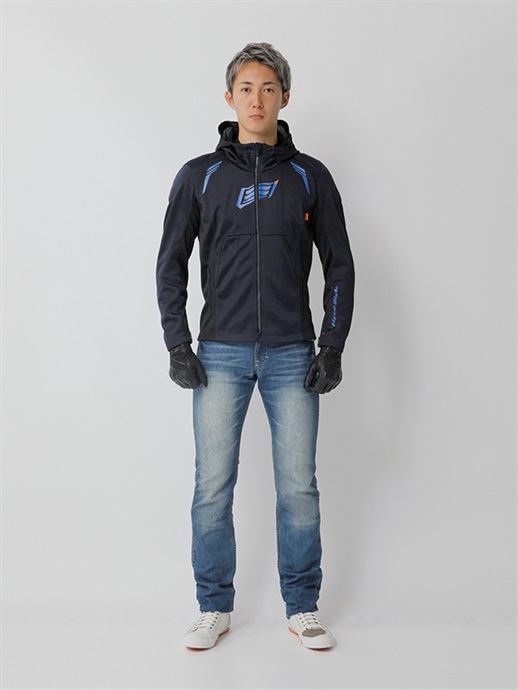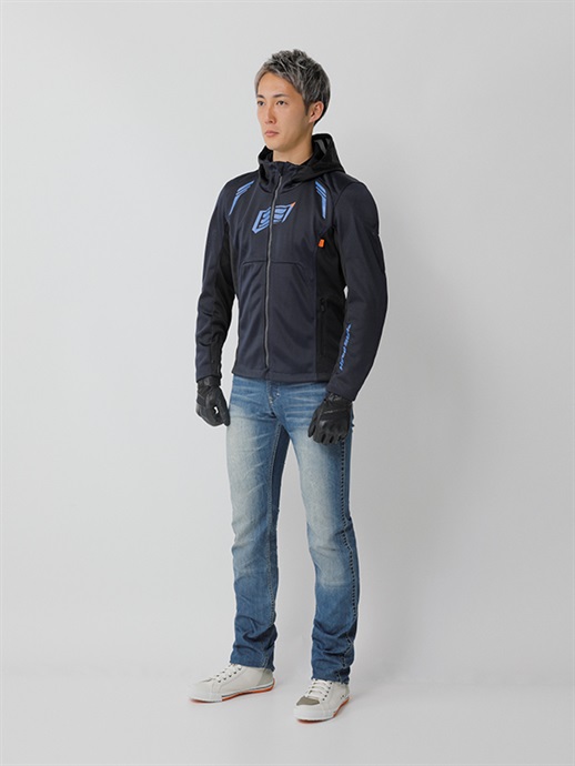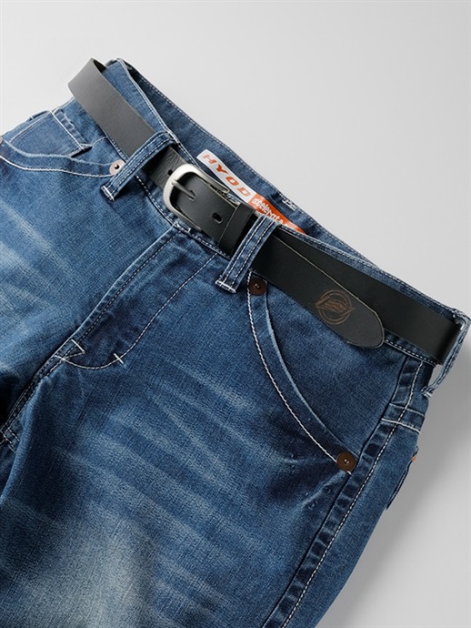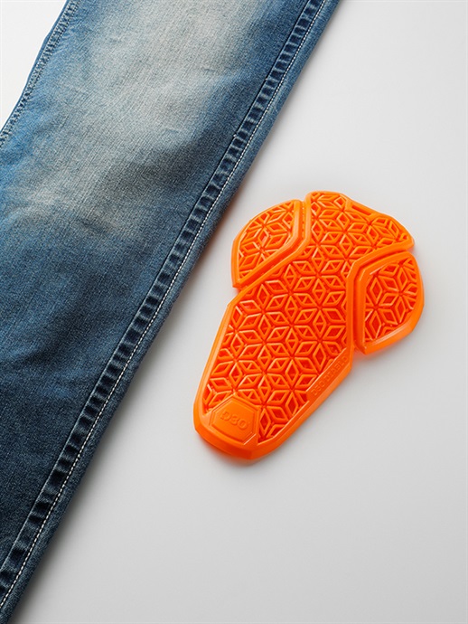 パターンには、股がみの深さを徹底的に研究して導き出されたHYODライディングデニムパターンを採用。前傾姿勢でも腰まわりがしっかりと追従し、背中が出にくい設計としています。足の開きを妨げず、膝も曲げやすい立体構造により、走行中の動きにもスムーズに対応。腰まわりのフィット感と安定感を確保しながら、自然なライディングポジションを支えます。