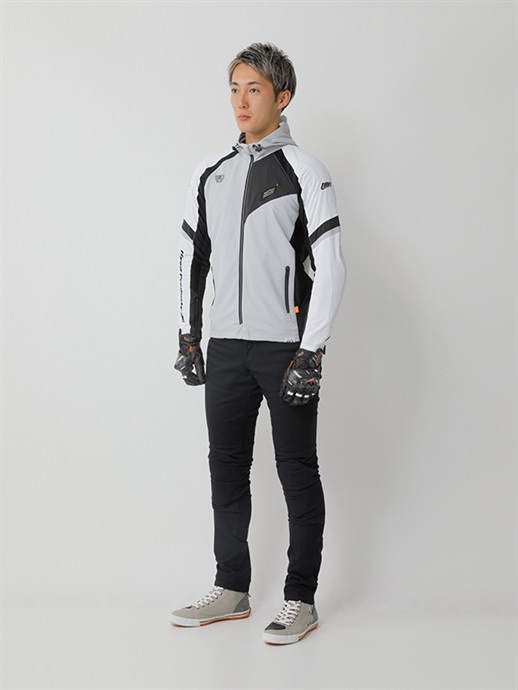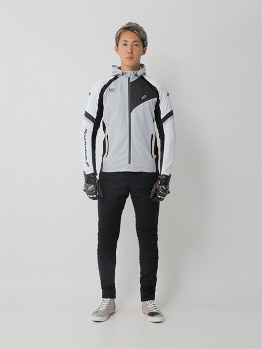 シルエットは、脚に沿ってシャープに仕上げたスキニースタイル。膝に切り替えを設けないミニマルなデザインとしながらも、立体的なパターンにより自然な可動域を確保しています。余計なボリュームを排したラインが脚をすっきりと見せ、バイクとの一体感を高めるスタイルに仕上げています。ヒップにはさりげなく配置されたHYODロゴがアクセントとなり、控えめながらブランドらしさを表現しています。