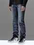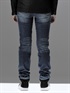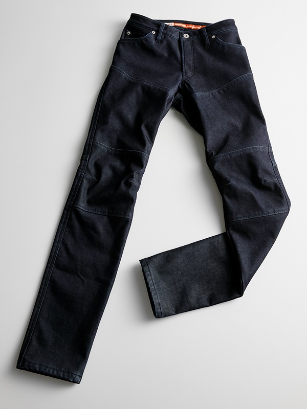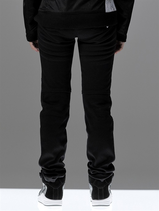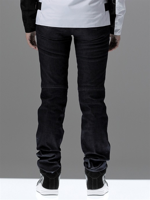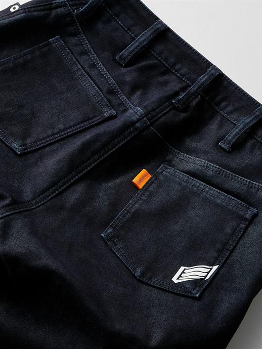 レギュラーオンスのストレッチデニム生地を使っています。シルエットは、裾にかけてタイトになっていくバイカーズパターンを採用しています。ブーツインスタイルやライドスニーカーとのカジュアルスタイルまで、すっきりとしたボトムラインを演出します。