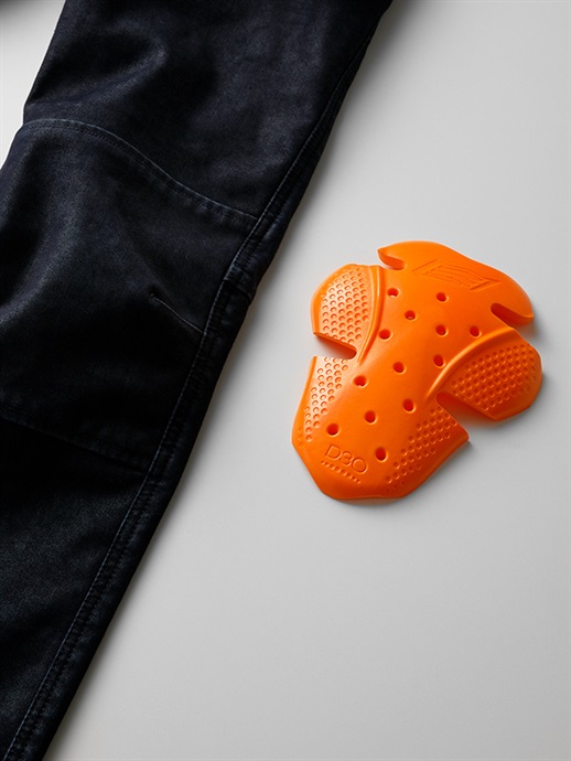 膝には衝撃吸収力と装着感に優れたD3O®プロテクターを標準装備しています(着脱可能)。体型に合わせて上下2段階の位置調節ができます。プロテクションがソフトでフレキシブルなため、着け心地やデザイン、シルエットなど多くのメリットを生み出しています。