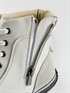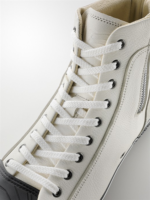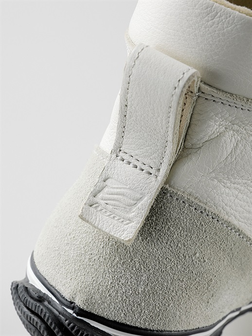 バルカナイズ製法を採用した“レザー・スニーカー”のハイカットモデル。ゴム底と靴本体を接着し、硫黄を加えた釜で熱と圧力をかけるバルカナイズ製法にて製造。素足感覚の履き心地で、履き込むほどに足になじみます。素材には柔らかいカウレザーを採用しました。サイドジップを装備しておりますのでスムーズな脱ぎ履きが可能。左足にはラバーシフトパッドを装備。履き口にはふんわりとしたパッドが入り、フィット感抜群の優しい履き心地です。インソールは天然ゴム=ラテックスラバー製となります。バルカナイズ製法とはゴム底と靴本体を接着し、硫黄を加えた釜で熱と圧力をかける製法。170年以上もの前の1839年に、アメリカの発明家チャールズ・グッドイヤーが発明した、まさに〝スニーカーの基本製法”。底とアッパーの結合が強く、底が剥がれにくい、型崩れしにくい、といった基本性能がある反面、基本的に手作業による作業のため、想像を絶する労力と手間がかかり、生産効率が悪い。現在、日本でバルカナイズ製法を行なっている企業は3社と言われている。サイズは、M(25.0-25.5)L(26.0-26.5)LL(27.0-27.5)