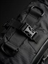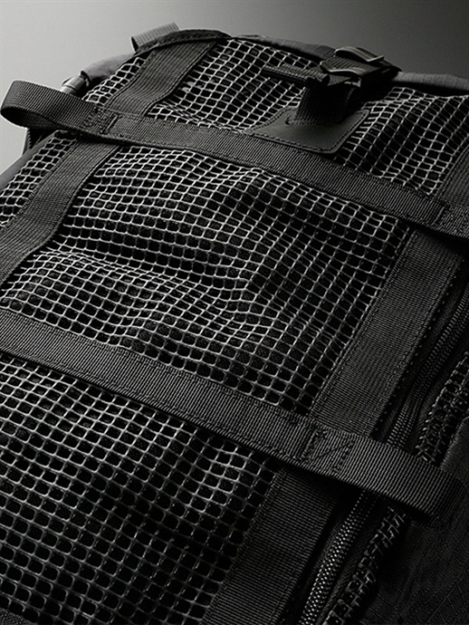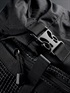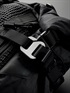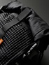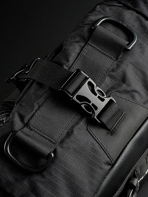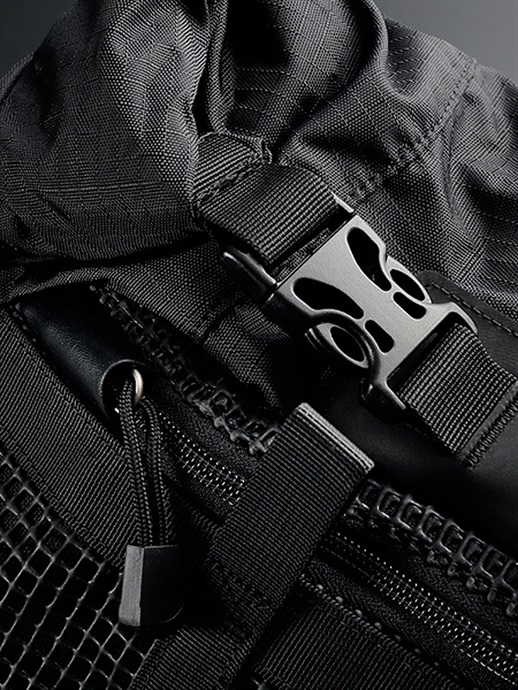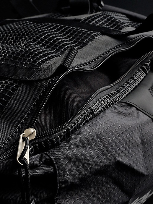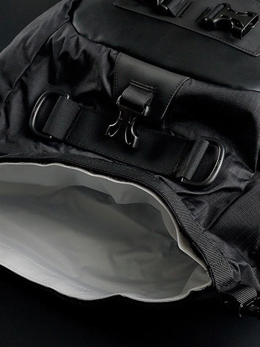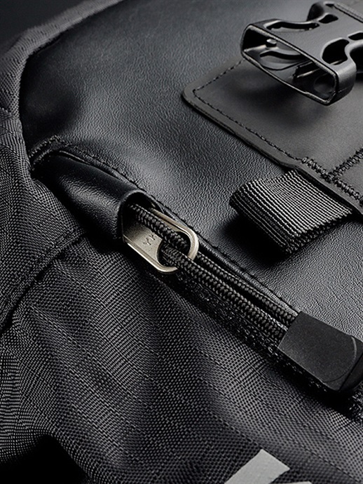メインコンパートメントは、100%ウォータープルーフ・ロールトップ仕様となっています。本体荷室の内側に配された防水ホワイトインナーライナーは、中身の確認がし易く、取り外しも可能ですので、メンテナンスも容易です。レインカバーの必要がないので、突然の雨や高速走行などでも安心です。本体と同じくらいの面積のサイドポケットにはYKK®止水ファスナーを採用しています。本体底部は、すべり抑制のためラバーメッシュ素材が採用され収納ポケットもかねています。