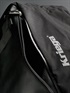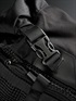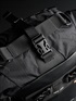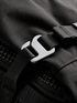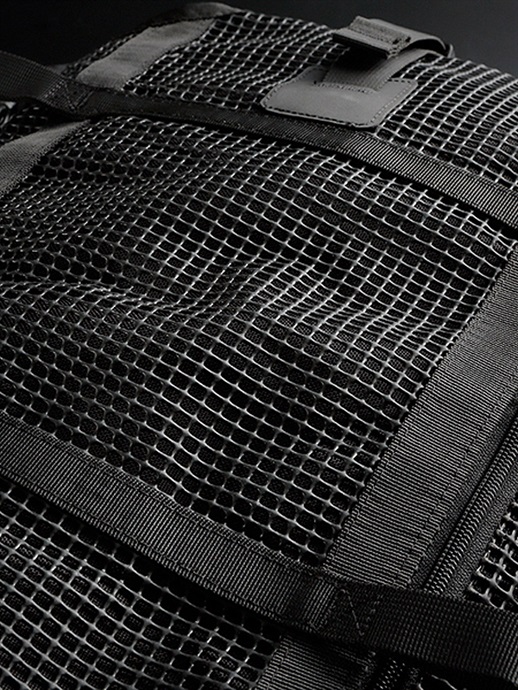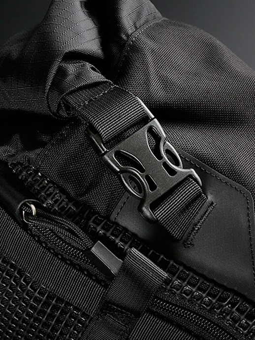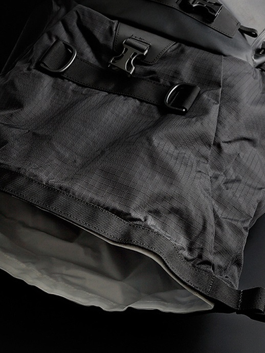 メインコンパートメントは、100%ウォータープルーフ・ロールトップ仕様となっています。本体荷室の内側に配された防水ホワイトインナーライナーは、中身の確認がし易く、取り外しも可能ですので、メンテナンスも容易です。レインカバーの必要がないので、突然の雨や高速走行などでも安心です。本体と同じくらいの面積のサイドポケットにはYKK®止水ファスナーを採用しています。本体底部は、すべり抑制のためラバーメッシュ素材が採用され収納ポケットもかねています。