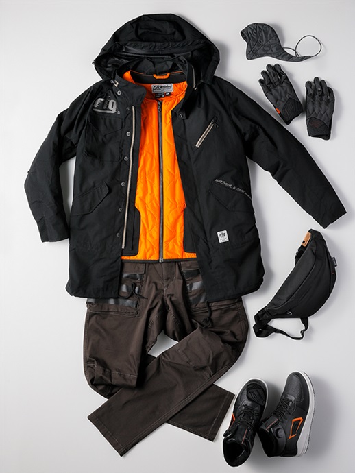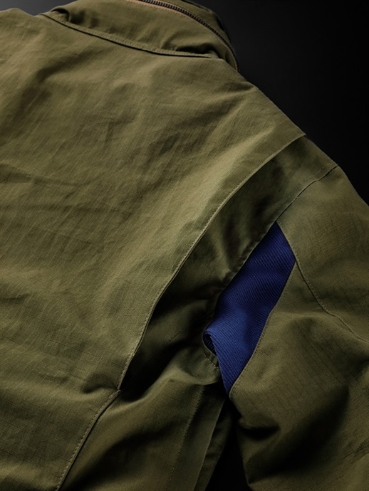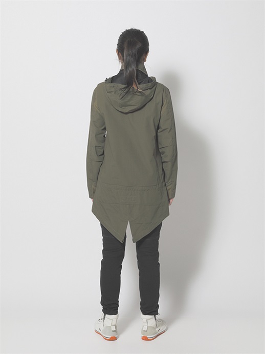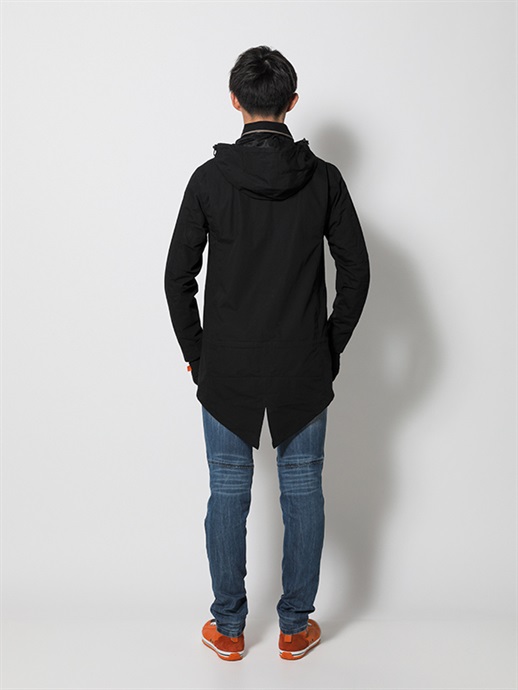 フードを収納したり、“フィッシュテール”と呼ばれる後裾を折りたたんだりすることができます。好みのスタイルやTPOに応じて着こなすことができるのもこのウエアの楽しみのひとつです。