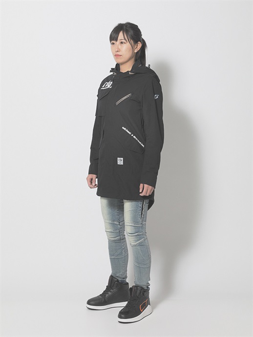 ヒップ周りのドローコードを絞り、裾部のドローコードを大腿部に巻き付けることにより、ライディングの妨げとなるロング丈のデメリットを解消しています。