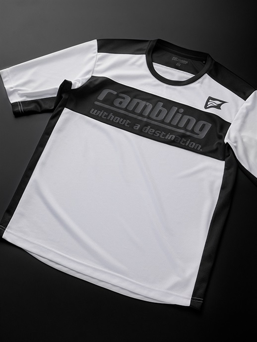 胸に大きく“rambling” 、左胸にワンポイントでロゴマークをプリントしています。左袖口には刺繍を施し、アクセントとしています。