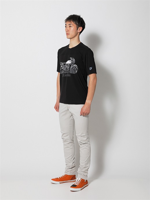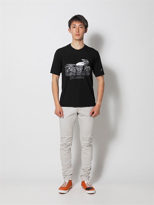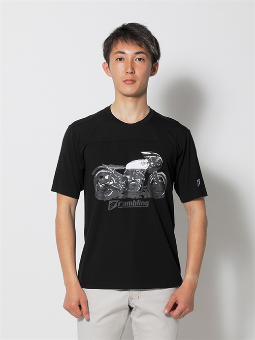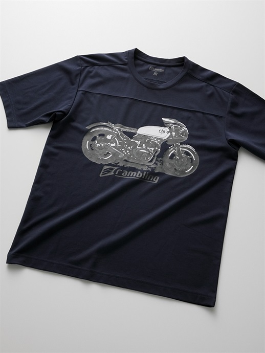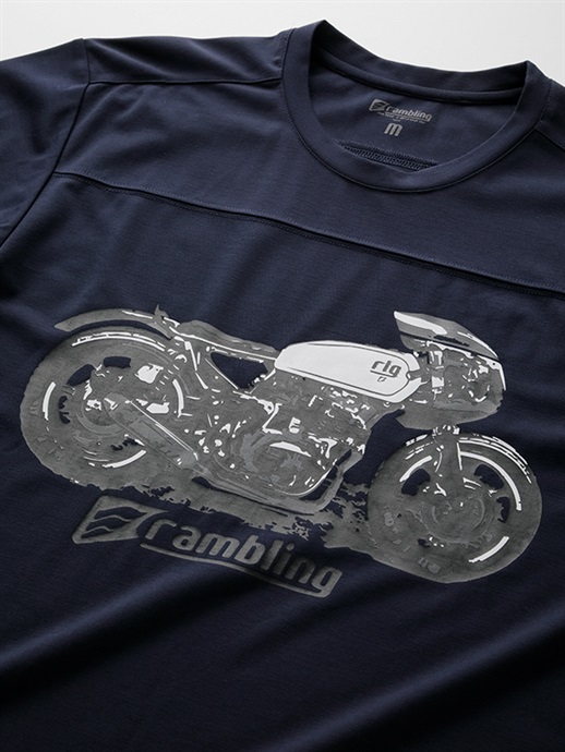 フットボールシャツをモチーフにデザインされたランブリングのTシャツ。胸にモーターサイクルのイラストを大きくプリントするほか、右肩後ろにはramblingのロゴをプリントで入れています。