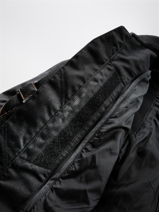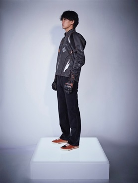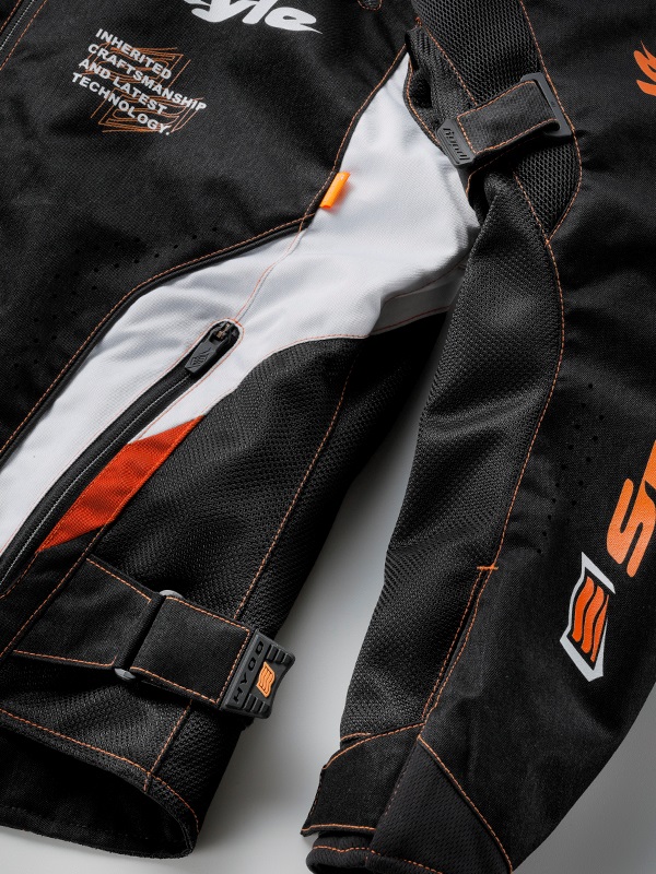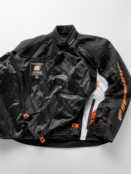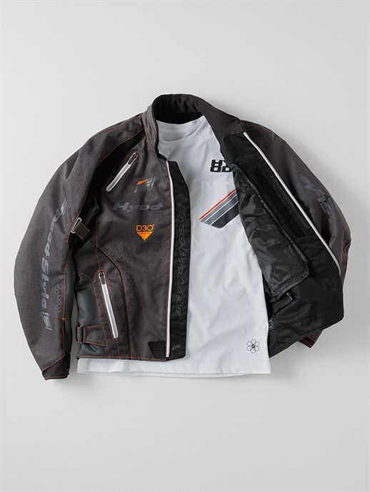 前身と両袖にロゴやマークを散りばめたスポーツテイストあふれるテキスタイルジャケットです。表素材は上質なテキスタイル素材と発色性に富んだブライトⅡメッシュ、内側には気温の変化に対応する着脱可能なウインドブロックインナーを装備しています。肩と肘にはソフトでフレキシブルなHYODオリジナルのD3O®プロテクター(CE規格を認証)を搭載。ライディング時の快適さを重視したHYOD独自のST-Xパターンが、走行時の抜群のフィット感と安心感を生み出しています。胸のファスナー式エアインテークや前傾ポジションをサポートする両脇のシャーリング、上腕部とウエスト脇部分のフィッティングアジャスターなど、ライディングウエアとしての機能が充実したモデルとして、ライディングを重視するライダーを中心に高い評価を得ています。