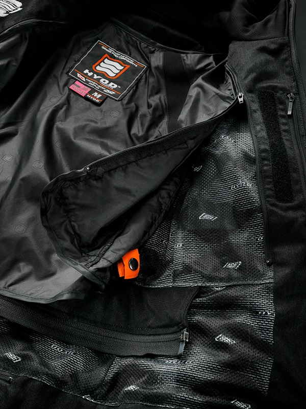 ジャケットの内側にHYOD D3O®チェストプロテクターを装着するアタッチメント(面ファスナー)を装備しています。ワンピースタイプのチェストプロテクターは2カ所で固定することができます。