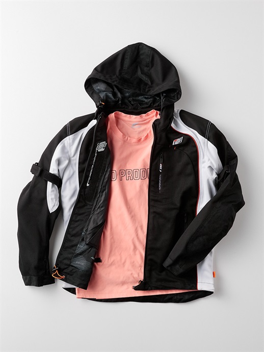 ファスナーでジョイントしているフードは取り外すことができます。高速走行などによりフード部分のバタつきが気になるときやジャケットの印象を大きく変えたいとき、自分の好みやTPOに応じて使い分けができるのもフーデッドウエアの特徴のひとつです。