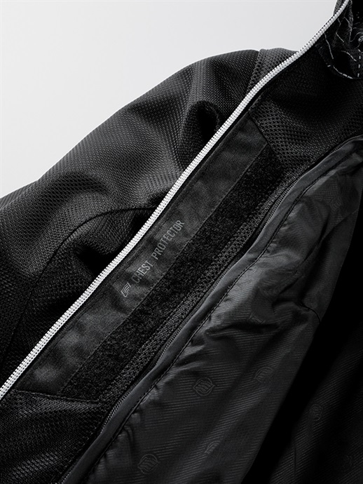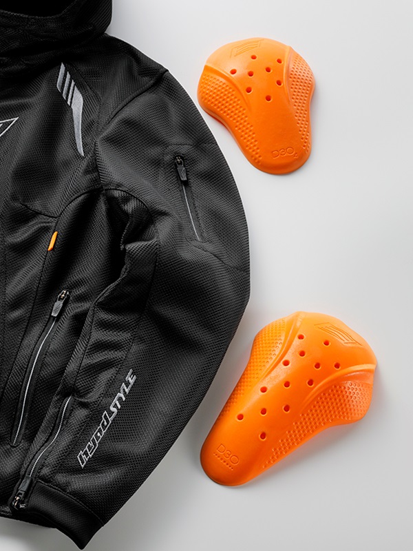 涼しさを追求するとメインマテリアルがどうしてもライトなものになるため、インナープロテクターの充実装備でハイスペックな安全性能を確保しました。肩、肘のプロテクターにはソフトで着用時の違和感が少ないD3O®プロテクターを装備。快適な着心地で、かつハイスペックな安全性能を誇ります。もちろんいずれのプロテクターも欧州の厳しい安全基準「CE規格」をクリアしています。