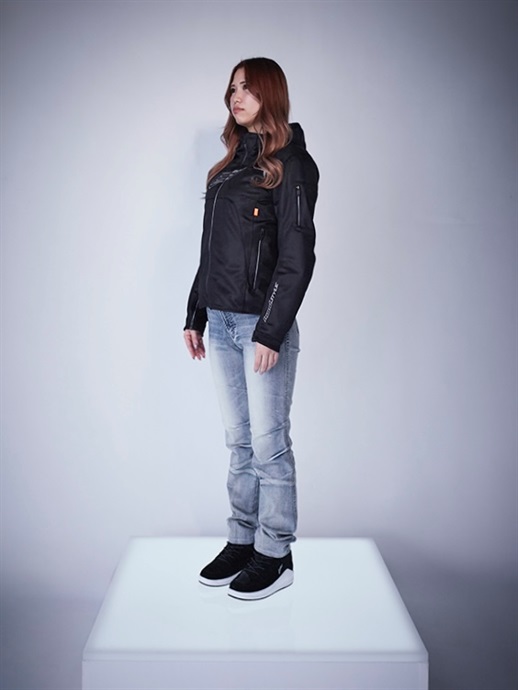 バイクに乗る姿勢をとると腕が自然に前に出て、ジャケットも持ち上がらず、背中は身体の自然な緩いS字状のラインにしなやかに添う。そして普通に歩いていてもとても自然に身体の動きに追従する。