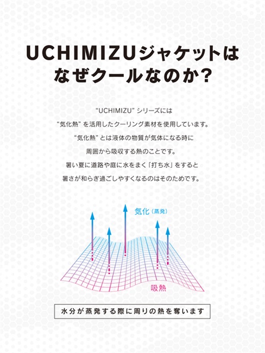 “UCHIMIZU(ウチミズ)”シリーズには“気化熱”を活用したクーリング素材を使用しています。“気化熱”とは液体の物質が気体になる時に周囲から吸収する熱のことです。暑い夏に道路や庭に水をまく“打ち水”をすると暑さが和らぎ過ごしやすくなるのはそのためです。