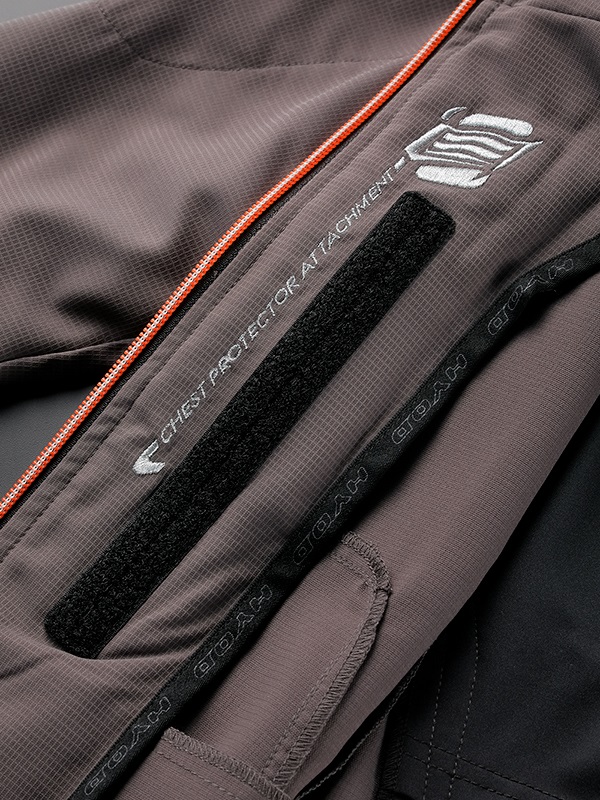 ジャケットの内側にHYOD D3O®チェストプロテクターを装着するアタッチメント(面ファスナー)を装備しています。ワンピースタイプのチェストプロテクターは2カ所で、ツーピースモデルは左右それぞれ1カ所で固定することができます。