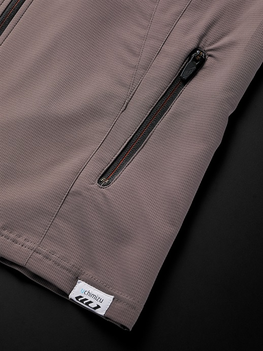 優れたストレッチ性と適度なUV性を兼ね備えた“UCHIMIZU”素材はサマーシーズンでも快適な着心地のハイテクマテリアルです。発生した汗を肌側の繊維が素早く吸収し、生地表面の気化促進繊維が蒸発を加速させることで、衣服内の熱を奪い温度を抑える効果があります。