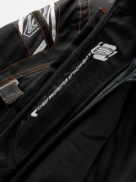 ジャケットの内側にHYOD D3O®チェストプロテクターを装着するアタッチメント(面ファスナー)を装備しています。ワンピースタイプのチェストプロテクターは2カ所で、ツーピースモデルは左右それぞれ1カ所で固定することができます。
