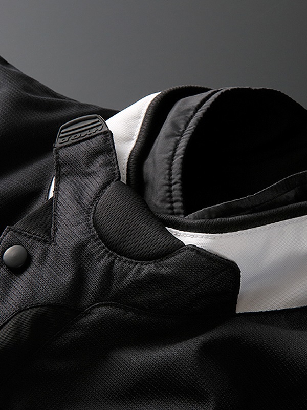 襟には肌触りが良く着用感に優れたストレッチニットを採用しています。これらの部分はバイク乗車時にジャケットと肌が触れる部分であり、肌触りをよくすることで運転に集中できる環境をもたらします。