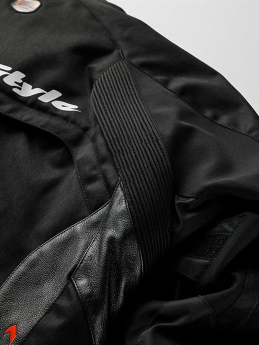 肩口にファスナー式のエアインテーク、背中にはエアアウトレットを装備してベンチレーション効果を高めています。また、前傾姿勢でのライディングポジションにも対応するシャーリングを背中の脇部分に装備しています。