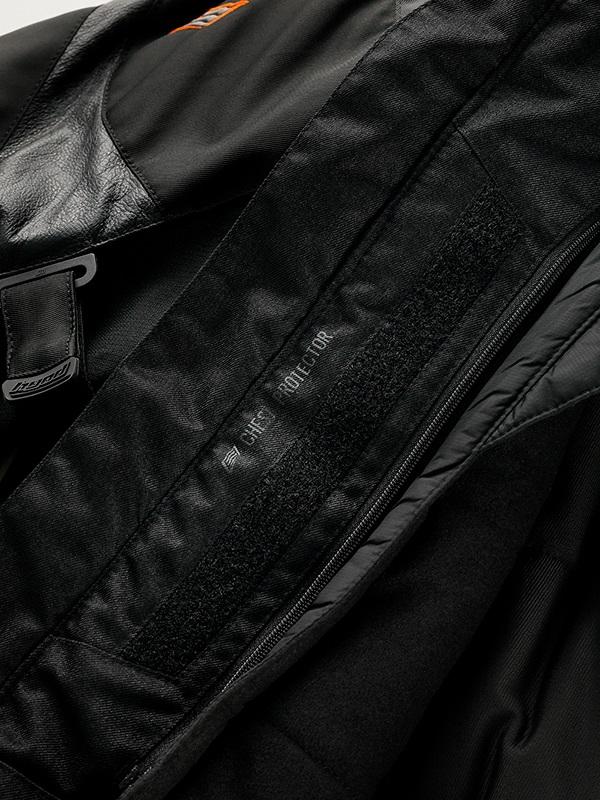 ジャケットの内側にHYOD D3O®チェストプロテクターを装着するアタッチメント(面ファスナー)を装備しています。ワンピースタイプのチェストプロテクターは2カ所で、ツーピースモデルは左右それぞれ1カ所で固定することができます。