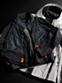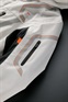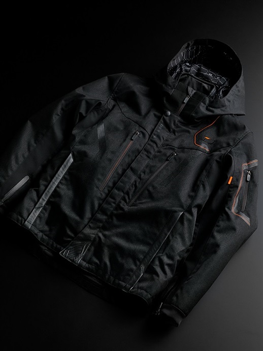 クレストマークの刺繍ロゴ、プリント回路板をモチーフにした近未来的なグラフィック、セミオートマチックロックタイプのファスナーなどディテールにもこだわりました。襟は肌にやさしいストレッチニットを部分使いしています。