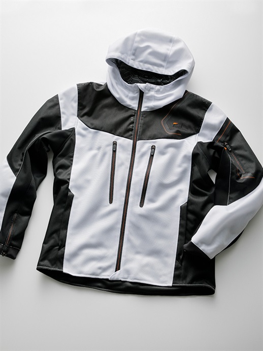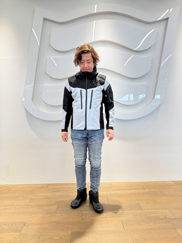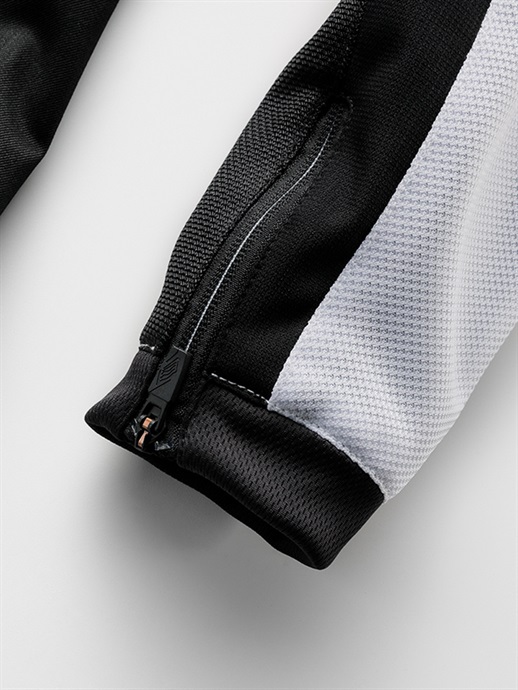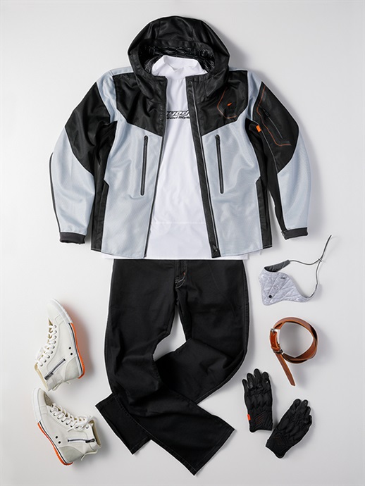 なめらかな風合いのテキスタイルと、光沢感のあるブライトⅡメッシュを組み合わせた、上質さと機能性を兼ね備えたテキスタイルウエア。異なる質感をバランスよく構成することで、落ち着きのある佇まいの中にさりげないスポーティさを加えています。走行時だけでなく、バイクを降りた後のシーンにも自然に馴染む一着です。