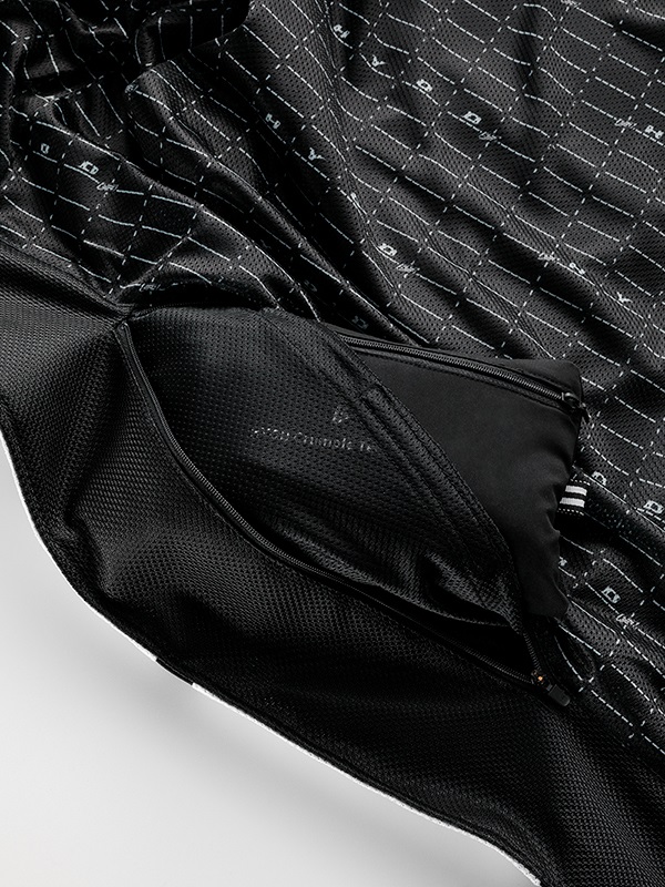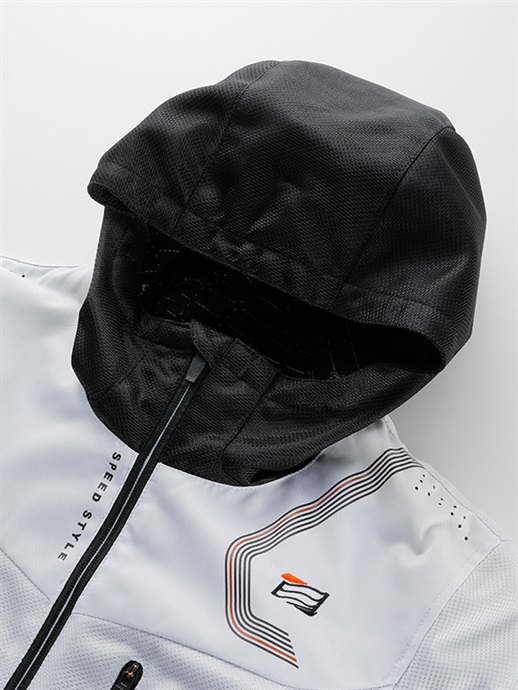 防風効果のあるEVOKEシリーズのインサレーションウエアとのレイヤリングにも対応し、袖口のスナップボタンでジョイントが可能。気温の変化に応じた柔軟な着こなしを支えます。さらに、走行時にフードのバタつきが気になる場合は、フード本体をコンパクトに畳んで固定できる仕様とし、シーンや好みに合わせた使い分けにも配慮。