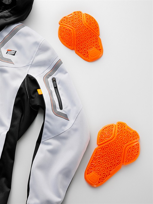 マテリアルは、しなやかさと適度なハリを備えたテキスタイルをベースに、通気性と発色性に優れたブライトⅡメッシュを要所に配置。軽快さを保ちながら、質感の高さを感じさせる仕上がりです。プロテクションには、薄く柔軟なエアースルー構造のD3O® Diablo™プロテクター(CE規格 LEVEL1)を肩・肘に装備。軽量で動きを妨げにくく、まるで着けていないかのような自然な装着感と安心感を両立しています。