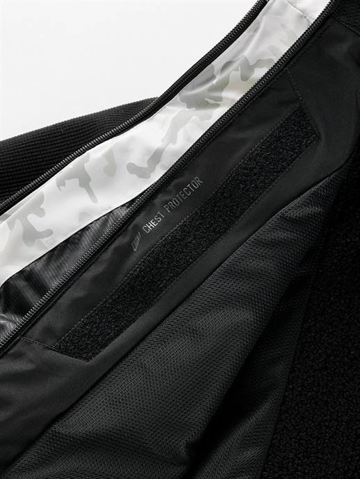 ジャケットの内側にHYOD D3O®チェストプロテクターを装着するアタッチメント(面ファスナー)を装備しています。ワンピースタイプのチェストプロテクターは2カ所で、ツーピースモデルは左右それぞれ1カ所で固定することができます。