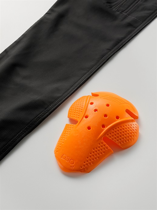 膝には衝撃吸収力と装着感に優れたD3O®プロテクターを標準装備(着脱可能)しています。体型に合わせて上下2段階の位置調節ができます。プロテクションがソフトでフレキシブルなため、着心地やデザイン、シルエットなどの多くのメリットを生み出しています。