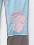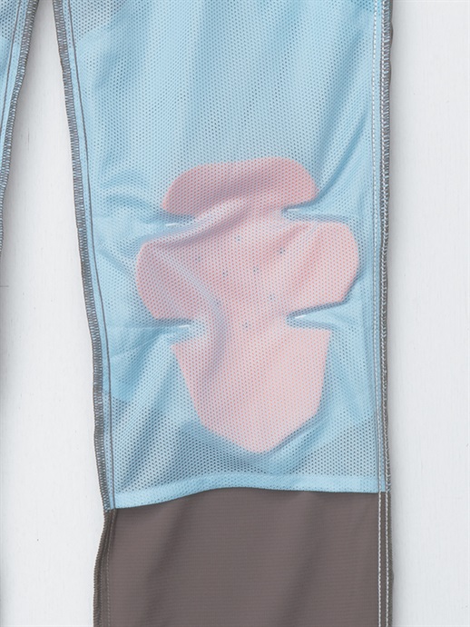 裏地(メッシュインナー)にプロテクターを装着する構造になっています。膝部分にプロテクターの位置を決めるステッチを設けていますので、それを利用して膝プロテクターの位置を2段階で調整することができます。標準装備の膝プロテクターは下側で装着されています。