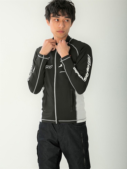 優れた吸汗性を持つストレッチ生地を採用。フロントファスナーを採用することで着脱性に優れています。発汗により発生する水分を吸収・拡散・放出させ、その際に発生する気化熱による冷感作用で素肌はいつもドライ感覚。※比較的タイトなサイズ感での仕上りとなります。モデル:身長180cm B83.5 W71 H89 / 着用サイズ:L
